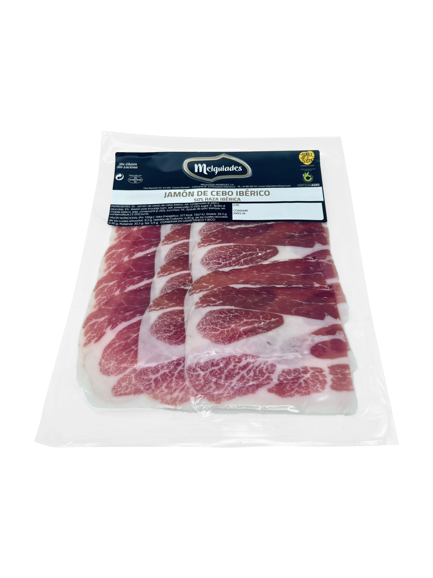 Jamón de Bellota Ibérico 50% Raza Ibérica. Certificado por Certicar, con 36 meses de curación. Presentado entero con pata o cortado a cuchillo y envasado al vacío en sobres de 100 gr. cada uno.